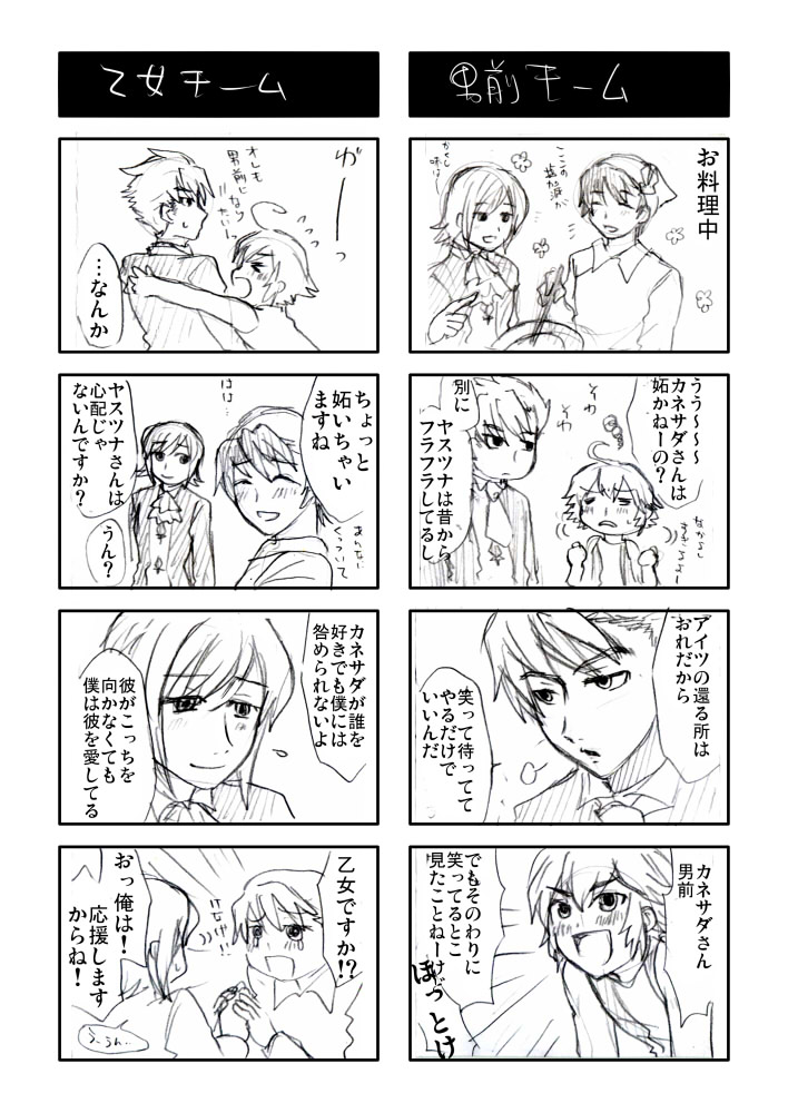 リスティア終戦一周年おめでとうございますお祝いものをなにも用意できなかったのでお蔵出しでも…オールキャラ本考えてたときに終戦宣言されて没になったやつ全員が武器を構える構図は、リスティアが平和になった今は似合わないかもしれない。(そういう意図で、終戦記念本の表紙は誰も武器を持っていないものになりました。) アサヒちゃんとツバサくん性別詐称の中性的なふたり、本来の姿で。 ワタクマ夫婦&カネヤス夫婦(※BL4コマ漫画劇場)
